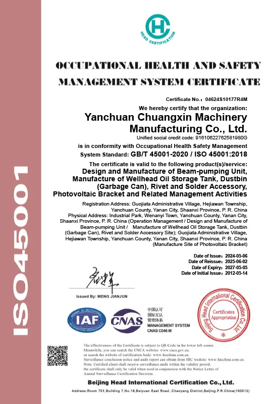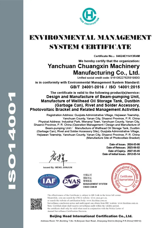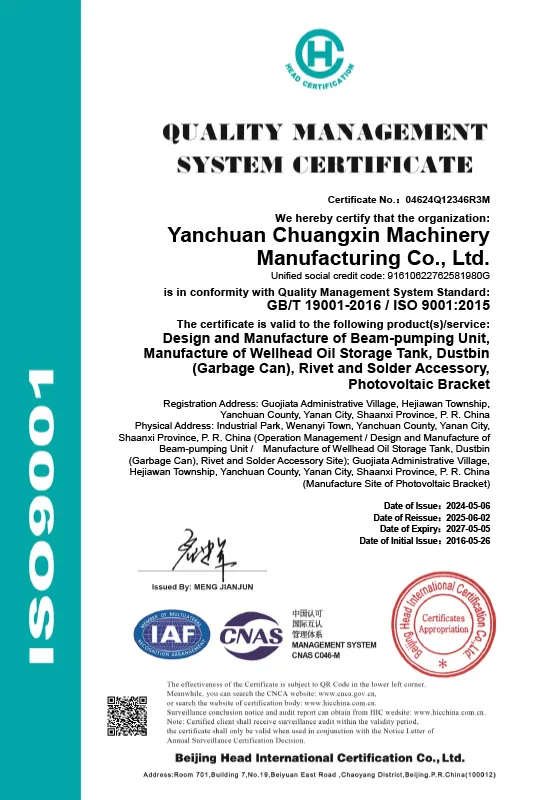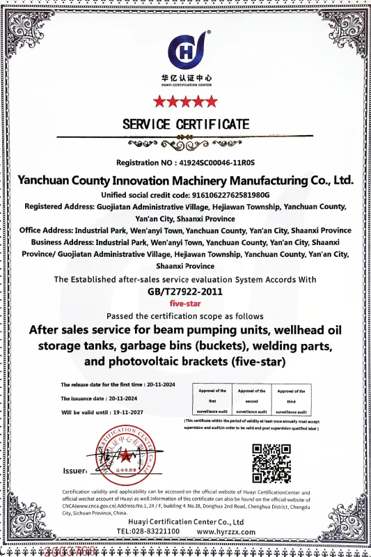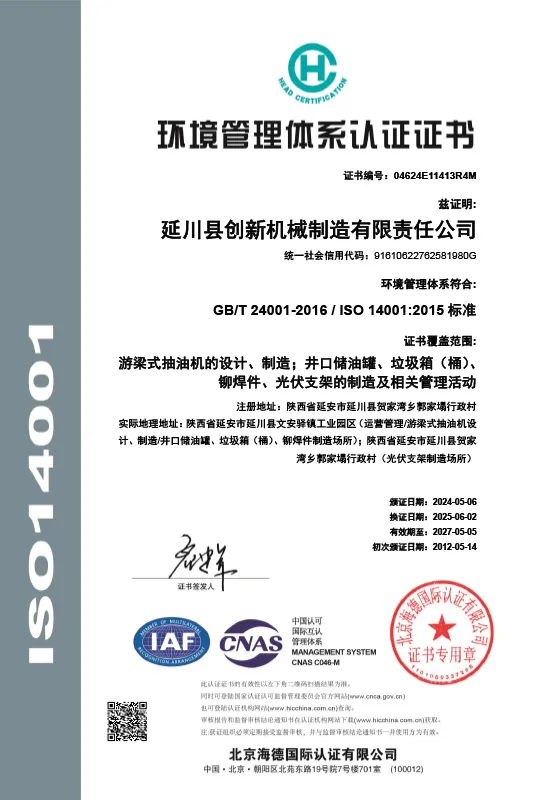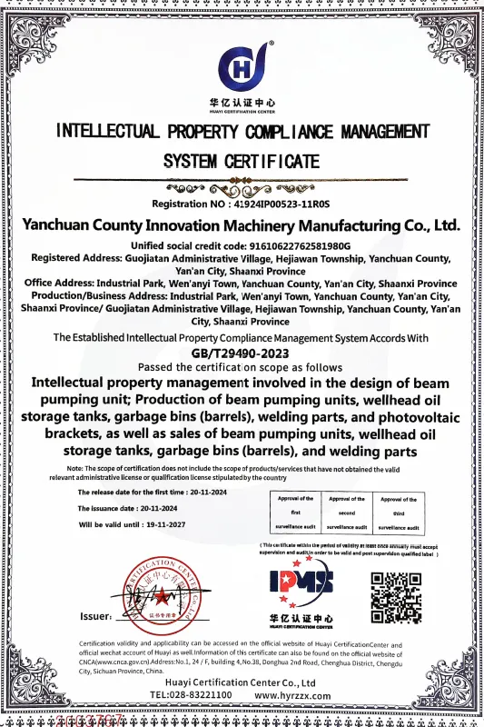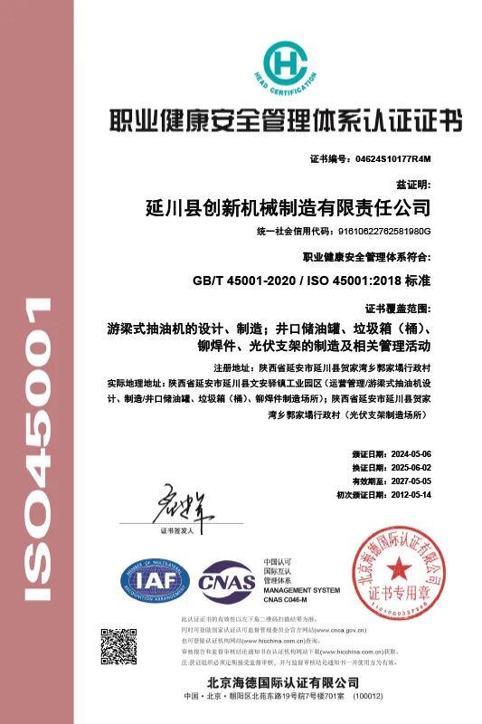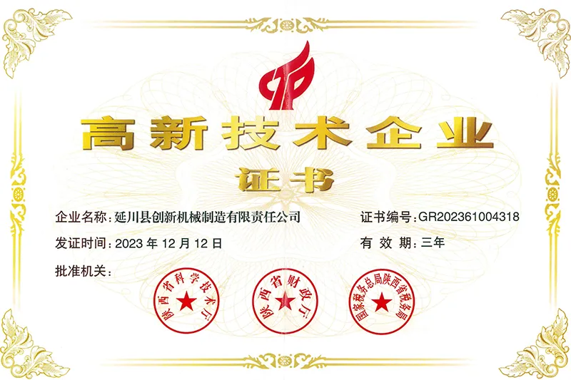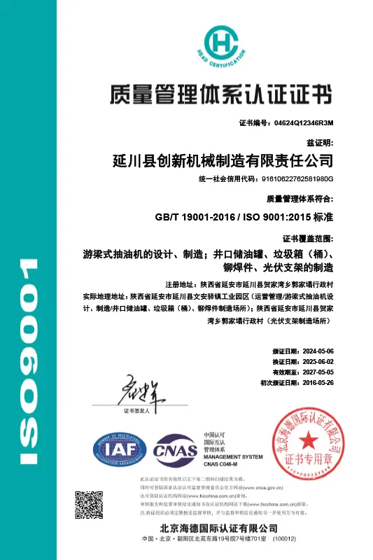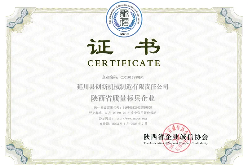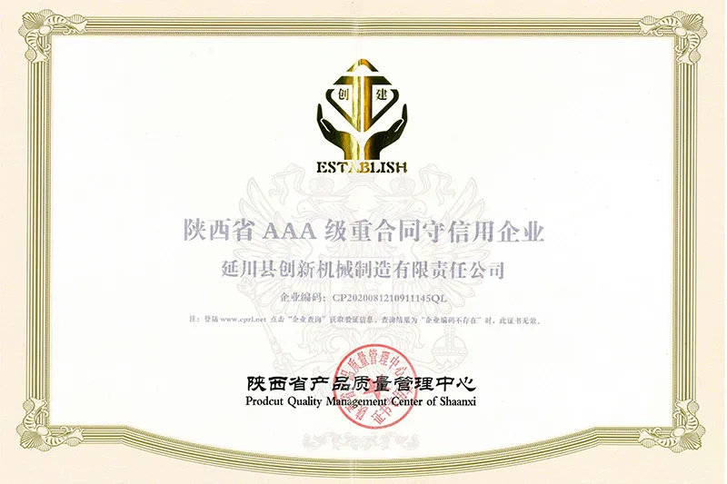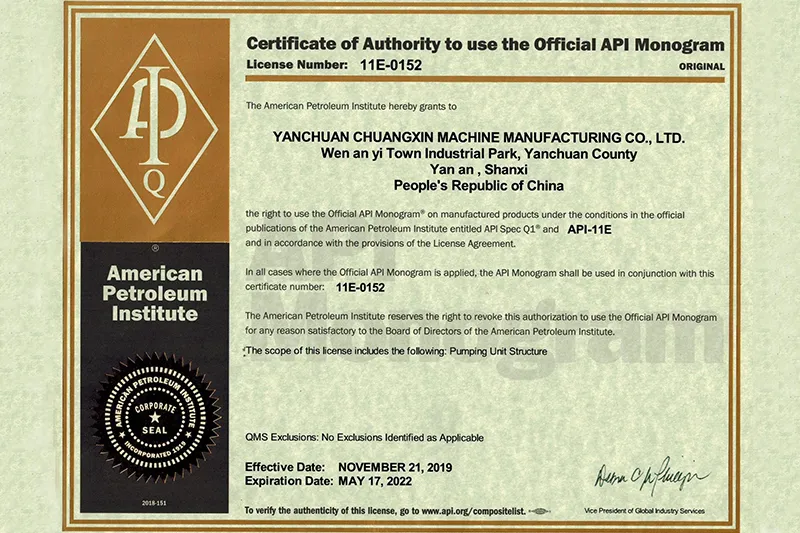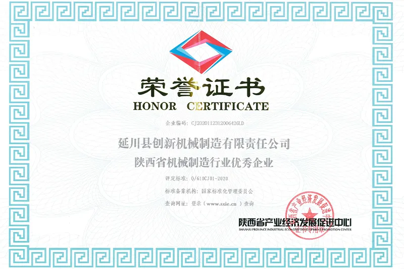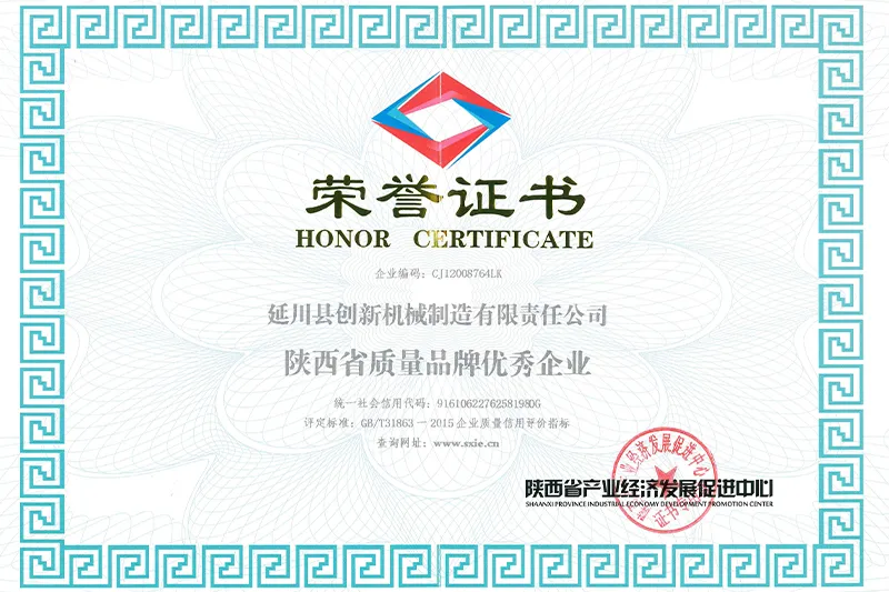Основные сертификаты: Лицензия на производство промышленной продукции национального уровня, сертификация API Spec 11E Американского института нефти, сертификация системы менеджмента качества ISO 9001, сертификация системы измерения ISO 9002, сертификация системы экологического менеджмента ISO 4001, сертификация системы профессионального здоровья и безопасности OHSAS 8001, сертификат соответствия системы управления интеллектуальной собственности, сертификат обслуживания, сертификат предприятия высокой и новой технологии, сертификат кредитного рейтинга уровня 3A для предприятий-участников тендеров, звание «Предприятие-образец качества провинции Шэньси», звание «Честная организация уровня 5A провинции Шэньси», звание «Отличное предприятие провинции Шэньси по качеству и бренду». Продукция станков-качалок получила разрешение на доступ в сеть закупок материалов первой категории Китайской национальной нефтегазовой и химической корпорации, разрешение на доступ в сеть материалов первой категоции Китайской национальной офшорной нефтяной корпорации (CNOOC), разрешение на доступ в сеть поставщиков материалов первой категоции Китайской национальной нефтегазовой корпорации (CNPC). Имеются 2 патента на изобретения и 5 патентов на полезные модели, а также получено звание «Национальное предприятие со стабильно квалифицированной продукцией по проверкам».